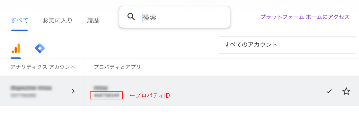 プロパティIDはGoogleアナリティクス4のホーム画面を開き、左上(アナリティクスのロゴの横に)ある下矢印をクリックしてプロパティセレクタを開くと確認できます。